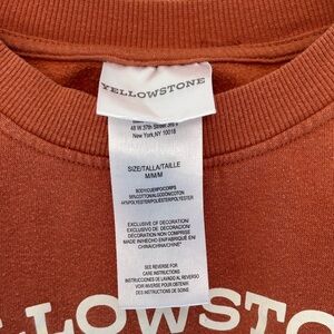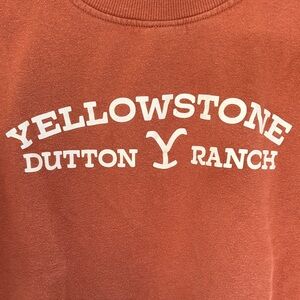 Cozy sweatshirt with 'Yellowstone Dutton Ranch' print. Burnt orange color. Medium. Hits right at the hips, not cropped but not long either. Perfect for casual wear.