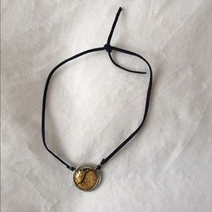 Mustard yellow and black pendent, circled in silver wire adjustable choker that's hand made! Great accessory for any occasion to dress up or down!!