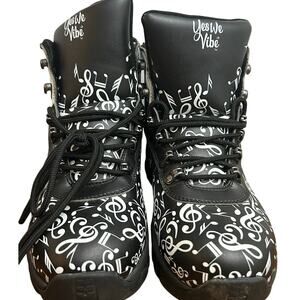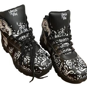 Brand new Yes We Vibe lace-up combat boots featuring an all-over black and white music note print with heart accents and bold “It’s Gonna Be a Good Day” text on the side. Premium vegan leather upper, chunky sole, and comfortable fit. Perfect for music lovers, streetwear enthusiasts, and festival style. Retails for $155 — this pair is new and never worn.