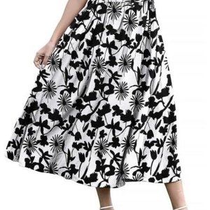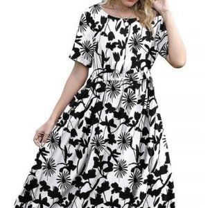 Yesno Boho Floral Print Maxi Dress Size Large White Black Short Sleeves Pockets