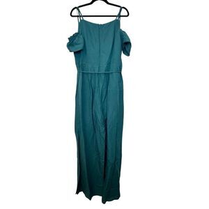 Yessica V-neck Tassel Tie Belt Cold Shoulder Linen Blend Jumpsuit Teal Large