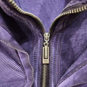 Stylish purple hoodie with ruffle details. Features a full zip closure. Long sleeves for added warmth.