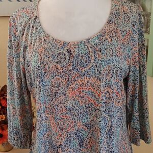 Vertical panels create this pretty "A" shape dress. The burnt out overlay is over a peachy lining. Size 12 measures 40 at chest, 40 at waist, 46 at hips. 38 long from shoulder to hem. Really pretty and softly comfortable