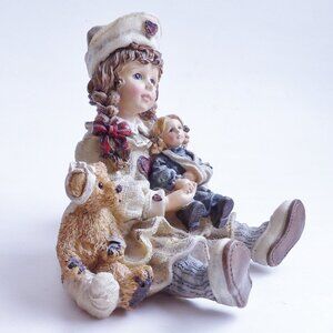 Beautiful figurine capturing a little girl playing nurse to to doll and teddy bear