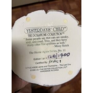 This figurine from The Dollstone Collection features a young girl holding a kitten. It is hand-painted and made of porcelain. The item measures 4 inches in length, width, and height. It is a limited edition piece from 1998, signed by the artists Jaimi and Thomasina.