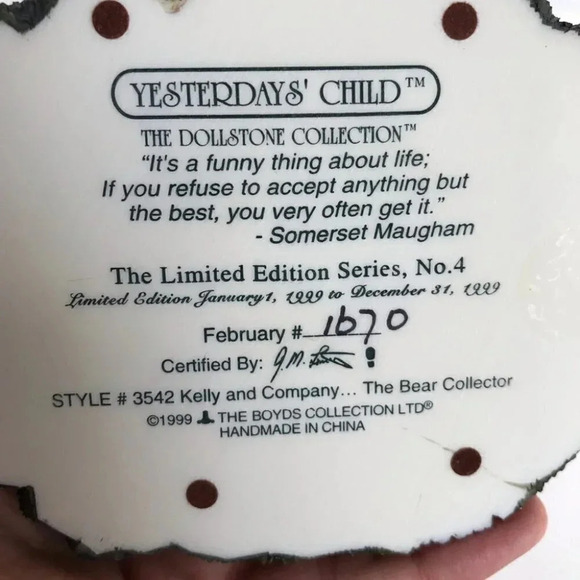 1995 Yesterdays Child Dollstone Collection Kelly and Company Bear Collector 3542