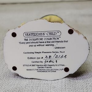 2 figures from the Yesterday's Child The Dollstone Collection. We have "Kendra with Kassidy & Lil' Pete...Garden Friends" and "Julie and Emmy Lou &Daphne...Garden Friends". Also included is a 5x7 picture frame. It us the same type but not labeled as Boyd's.