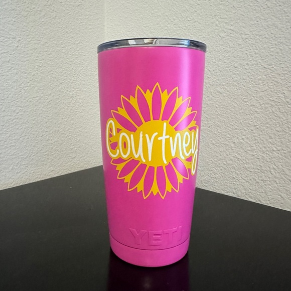 20oz hot pink yeti with decal.