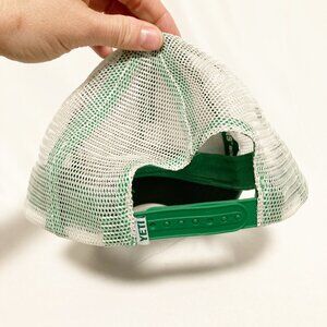Green & white snapback hat with Yeti Coolers embroidered in white font on the front. White mesh backing. Small Yeti logo tag at snapback.