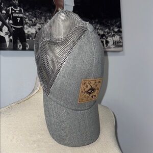 Classic gray trucker hat. Features a decorative patch. Comfortable mesh back.