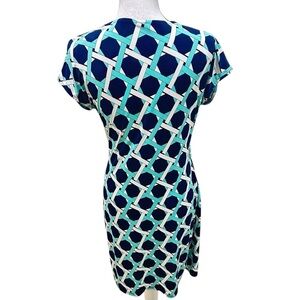 Stylish faux wrap jersey stretch dress with a geometric pattern. Features shades of blue, mint green, and white. yetts Los Angeles. Cool crisscrossed grommet chain belt side detail no size or fabric tag but know owner for size. Euc
