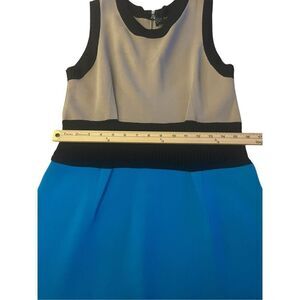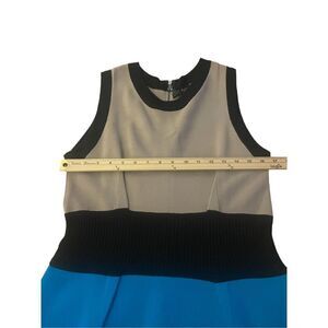 Yigal Azrouel Bodycon sweater dress In excellent Preowned condition, colorblock pattern in tan black, bright blue, sleeveless, fitted, pleated accents, exposed back zipper, scoop neck, knee length, Bodycon silhouette