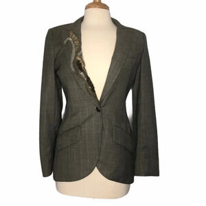 Costume Made Beautiful Yigal Azrouel 100% Gray Wool Tuxedo Blazer. One button closure style, elegant shoulder and silluette. Beautiful leaves like in velvet, beads, and sequins. The color is gray but has this handmade tiny blue and yellow flowers in vertical lines. The blazer is lined, has three front pockets with long sleeves.