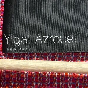 This vibrant Yigal Azrouel blazer combines a rich pink and orange woven pattern with a unique asymmetrical zipper closure. The collarless design and textured tweed-like fabric add a touch of sophistication, while the leather trim provides a striking contrast. Perfect for making a bold statement in any setting.