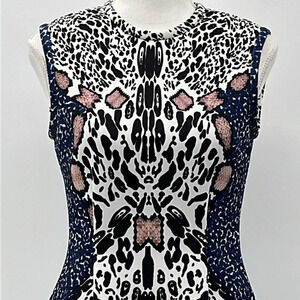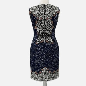 Yigal Azrouel Scuba Dress Cheetah Watercolor Print Sleeveless in Jet Multi - 6. Great pre-owned condition. Maybe a tiny bit of discoloration in the armpit area but it could just be deodorant marks, shown in pic. Fitted sheath scuba dress, sleeveless, round neckline, hidden back zipper with hook & eye closure, some stretch, polyester and spandex fabric blend, dry clean. Made in NYC, created by French Moroccan designer Yigal Azrouel.