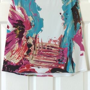 This beautiful skirt was made in the USA to feature an a-line silhouette with a low waist, mini length, a zipper closure at the left hip, and a full lining. It has a vibrant abstract art print that is predominantly pink, blue and white. It's soft, lightweight and breathable, making it perfect for Spring and Summer! Pairs great with solid tanks, camis or crop tops and sandals! Classic, cute, chic, and high quality!