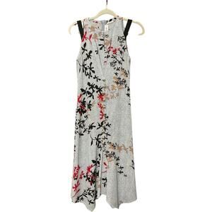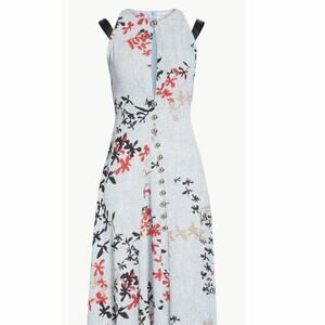 Cutaway satin shoulder straps and a front keyhole bare hints of skin in a mixed-floral midi dress made from lightweight Italian stretch crepe. Oversized ball buttons polish the look while drawing the eye down to the asymmetrical hem.50" length (size 8) Hidden back-zip closure Round neck Sleeveless Unlined 97% polyester, 3% elastane with 100% silk contrast Dry clean Made in the USA of imported fabric Collectors Item