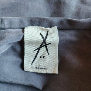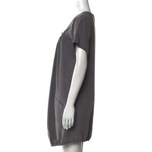 Chic Yigal Azrouël shift in solid gray with a square neckline, short sleeves, and subtle gathers. Practical pockets + elastic bubble hem create an easy cocoon silhouette—perfect work-to-weekend Yigal Azrouël piece.