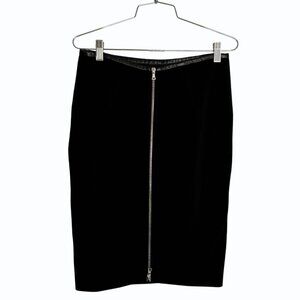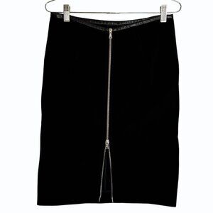Crafted with a sleek silhouette, this pencil skirt combines elegance and edge. Faux leather accents and silver zippers enhance its modern aesthetic.