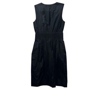 Modern-meets-classic little black dress by Yigal Azrouël. Sleek technical sheen with soft gathering through the bodice and skirt, a wide stretch waist panel that cinches the figure, and on-seam pockets (yes!). Fully lined and made in the USA—perfect for work, dinners, or cocktail parties.
