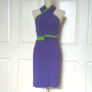 Rock this mod halter dress by Yigal Azrouel to that holiday party. Purple silk crepe with green trim. Cross front halter neckline. Racer back with cut-out. Exposed back half zip. Made in USA.