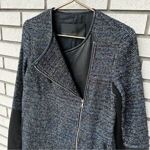 Yigal Azrouël, designer jacket, moto blazer, wool blend jacket, tweed blazer, asymmetrical zip jacket, lambskin leather trim, made in USA, luxury outerwear, edgy jacket, fall fashion, transitional coat, statement jacket, structured blazer, modern moto, runway style, streetwear chic, size 6, elevated essentials, black and blue jacket, leather sleeve jacket, fashion-forward layers, trending now, minimalist outerwear, cool weather staple, womenswear, upscale jackets, timeless layering piece, boutique brand