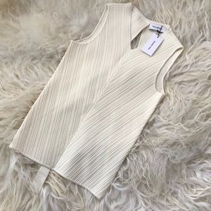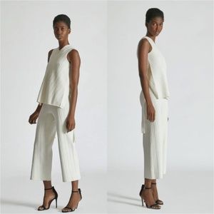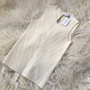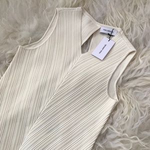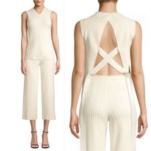 Ivory Yigal Azrouël sleeveless rib knit top with V-neck and cut out accent at back.