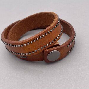 Yik Fung Wrap Leather Studded Detail Bracelet Snap Closure Brown 15.5 Inches