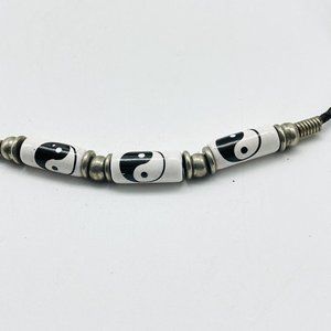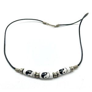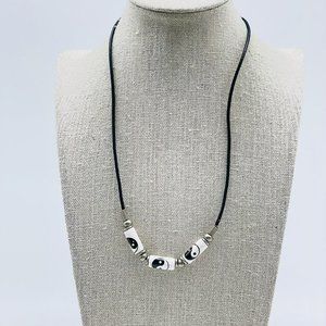 Yin Yang Beaded Necklace Silver Tone Black Cord Balance Boho Festival Party