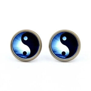 Yin Yang Zen Blue White Black Glass Cabochon Round Antique Bronze Stud Earrings