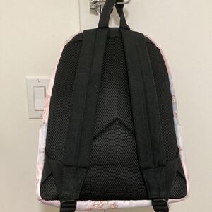 Yin Lang nylon backpack in pink & blue pattern by Soundbyte. Front zipper pocket, side pockets for water bottle, 3 open inside pockets, padded mesh back, hang hook and adjustable shoulder straps.