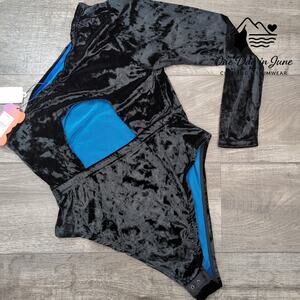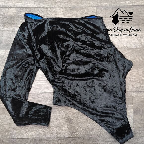 Sumptuous velour, rich as midnight whispers, drapes perfectly across this asymmetrical Yitty bodysuit. Its singular sleeve cuts a dramatic silhouette against bare skin, bearing witness to glamour that once floated through champagne-soaked ballrooms of another era.
