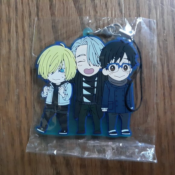 A Yuri!!! on ice anime keychain/strap/charm featuring the characters of the podium fam, Victor/Viktor Nikiforov, Yuri Plisetsky, and Yuuri Katsuki from the Yuri!!! on Ice Rubber Strap Collection Pair (Movic)! This is official merchandise imported straight from Japan and is in like-new condition, only displayed at most.