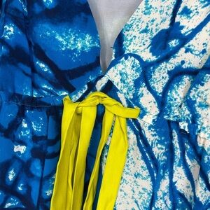 Make a statement with this stunning blue printed silk top from Yoana Baraschi. Crafted from 100% silk, this lightweight blouse features a bold abstract print in shades of blue and white, accented by a vibrant yellow tie waist for a pop of contrast. The flattering V-neckline and flutter ruffle sleeves add a feminine touch, while the adjustable waist offers a customizable fit. Perfect for both daytime and evening wear, this eye-catching piece brings effortless style and luxury to any wardrobe.