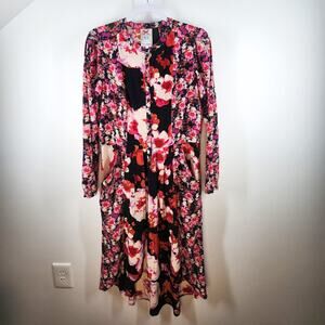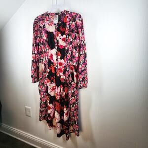 - Description: Pink floral long sleeve hi-low butt front dress; NOTE: belt loops are still attached, but belt is missing