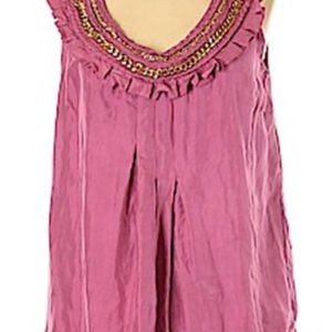 One of my all time favorite pieces that doesn't fit anymore. Beautiful magenta color with gold chain detail and ruffles. Fully lined. 100% Silk. Can be worn with anything through all seasons. My favorite outfit was wearing in the summer with a white A-line skirt and gold Tory Burch sandals. Looks so casual yet elegant. Excellent used condition. No rips, tears or stains.