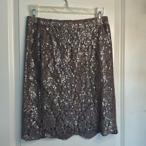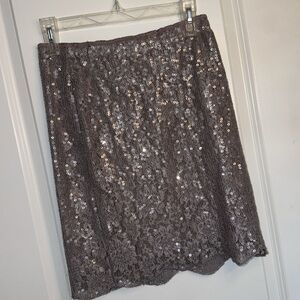 Midi, solid, embellished details, sequins & rhinestones, shiny accents, scallop, gray, silver, long, high rise waist size 0 no sense no rips from non-smoking home viscose lining