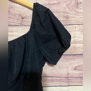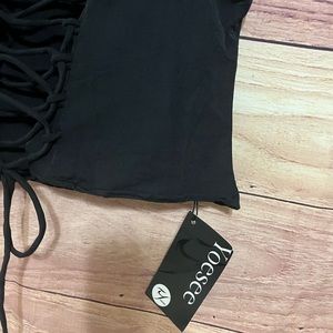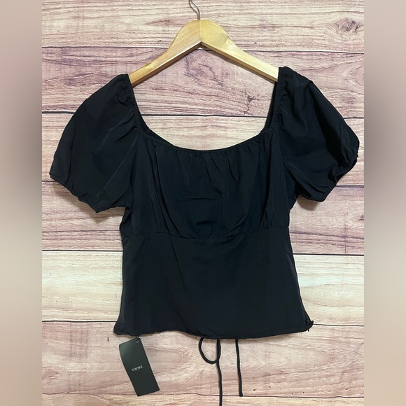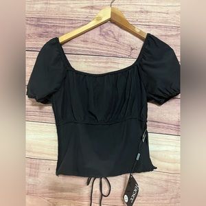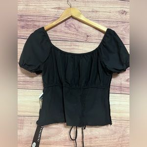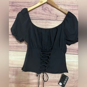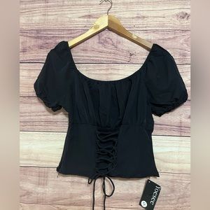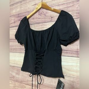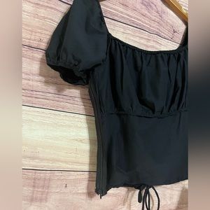 New blouse, completely black, no stains and damage, even on the side, it has a zipper, it is a corset type, very light and comfortable fabric