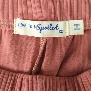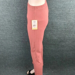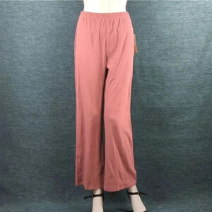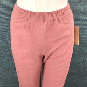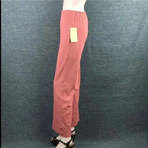 Comfortable and easy to live in! These pants are a soft, ribbed, flared, yoga style pant, elastic waist, ribbed material, cotton/poly blend. No pockets. They are mauve-pink
