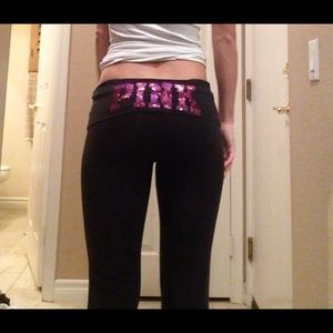 Victoria's Secret black yoga pants that fold over with the work pink in sparkles.