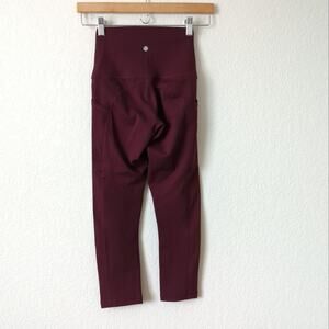yogalicious lux women's leggings size extra small polyester spandex stretchy fitted leggings with side phone pockets high-waisted plum purple cropped inseam 22 rise 10 flat across waistband 10"