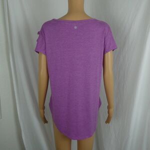 Nice heathered purple/pink tee with short sleeves and cold shoulder/crisscross strappy detail. It has light fuzzing but is overall in great condition. Perfect for jogging, yoga, pilates, whatever your exercise needs are!
