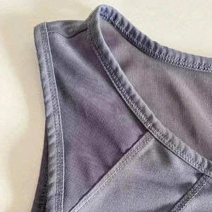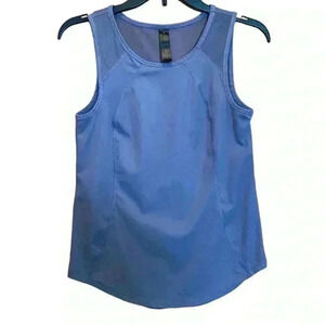 Yogalicious Top. Tank top style with mess sleeve and back. Princess seam in front runs from neck to hem. U shape hem at bottom. 88% Polyester 12% Spandex. Color: blue grey. Size XS. Measurements laying flat: Armpit to Armpit 16.5”. Shoulder to hem 23”. Waist 16.5”. Hem 17.5”. No rips, stains, tears or pills. Pet free smoke free environment.