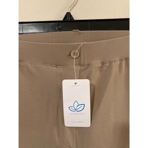 Comfortable beige tan yoga pants in a style that can take you to work also. These new with tags pants are a size XXL with a 29” inseam. Features moisture wicking fabric with a four way stretch and flat lock seams. Have belt loops, a faux fly, and back pockets. Straight leg with a slight flare.
