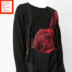This RARE black wool sarouel jumpsuit from Yohji Yamamoto features a loose fitting flowing design, a round neck, a sleeveless design, front and rear zip fastening/closure, 2 waist adjustment straps (outside), 2 front slip in pockets, 2 button flap side pockets on each side, 2 rear zip pockets, a dropped crotch, an adjustable fit and a straight wide leg. In addition, the jumpsuit has 6 interior buttons at the waistline that allow you to wear it with suspenders (sides folded down - see picture); NOTE: Jumpsuit does not include suspenders.