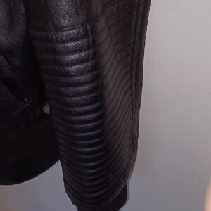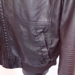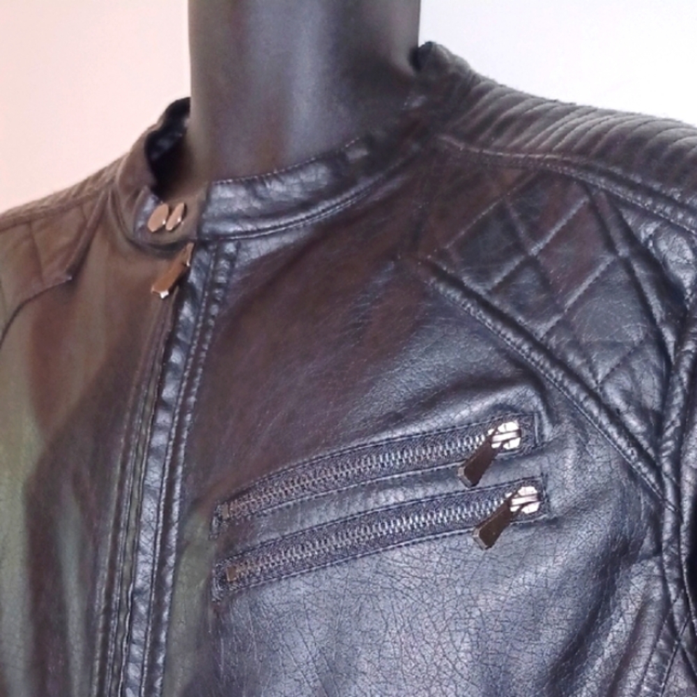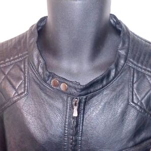 Discover the sleek elegance of the Yoki Black Moto Racing Jacket, a perfect blend of modern style and classic design. Crafted in a deep black hue, this jacket features a structured silhouette with a semi-glossy finish, making it a versatile addition to any wardrobe. Ideal for casual outings, it offers a timeless appeal with its clean lines and modern detailing. Note: The faux leather is ripped in the back, as pictured. Otherwise, it is in good, gently-used condition.