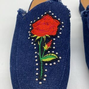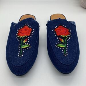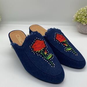 ✨ 🆕 ✨ Yoki Willas - 71 Embroidered Rose, Dark Denim, Frayed, Flat Mules✨ new in box✨