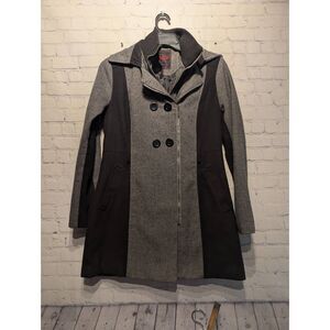 Condition:. Great pre-owned condition. A classic beautiful coat. The original belt however, is missing so I have paired it with a belt from BeBe that works great and aids in the flattering show of your curves since it is wide elastic and has a cute belt buckle on it that matches great. I plan to include it with the coat. You can always choose to get something different if it doesn't work out for you. :). No hood on this jacket. But it didn't come with one I don't think. The jacket is soft and lightweight but much warmer than its weight would suggest. This jacket was mine personally and I loved it. It is in great pre-owned condition and satin lined.