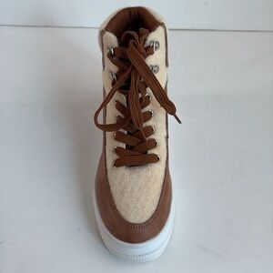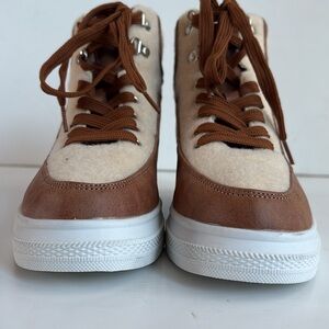 Great condition Yoki sneaker two tone cream faux cream faux fur and tan brown lace up sneaker. White sole. Clean.