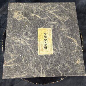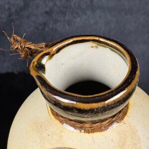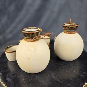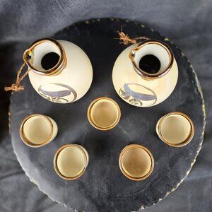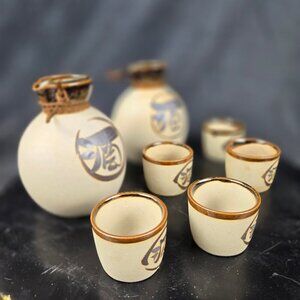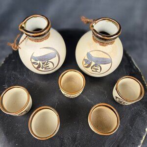 Yokohama Kanji Sake Set 2 Carafes 5 Cups Glazed Bisque Pottery Beige/Brown